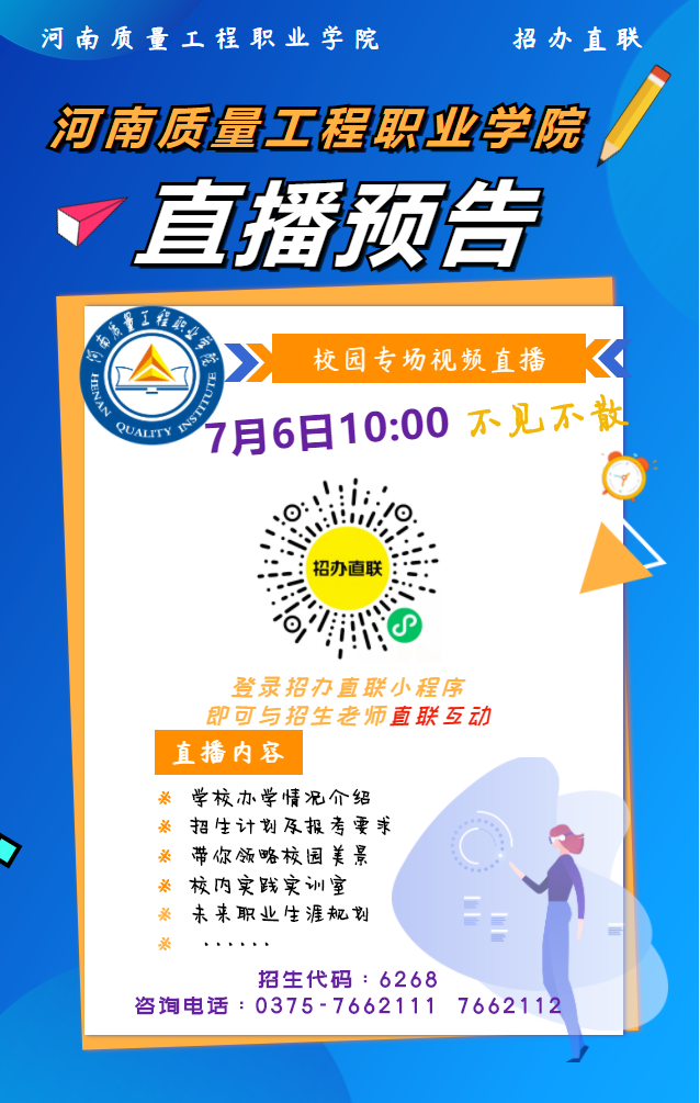 本次线上直播将由学校招生老师与各二级学院老师带你领略校园美景、宿舍、操场、实践实训室、仿真模拟室等等。让我们一起期待,在河质院相遇的故事。