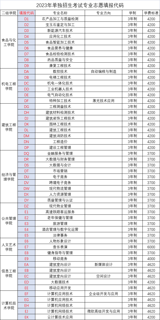 2023年单独招生专业报考代码