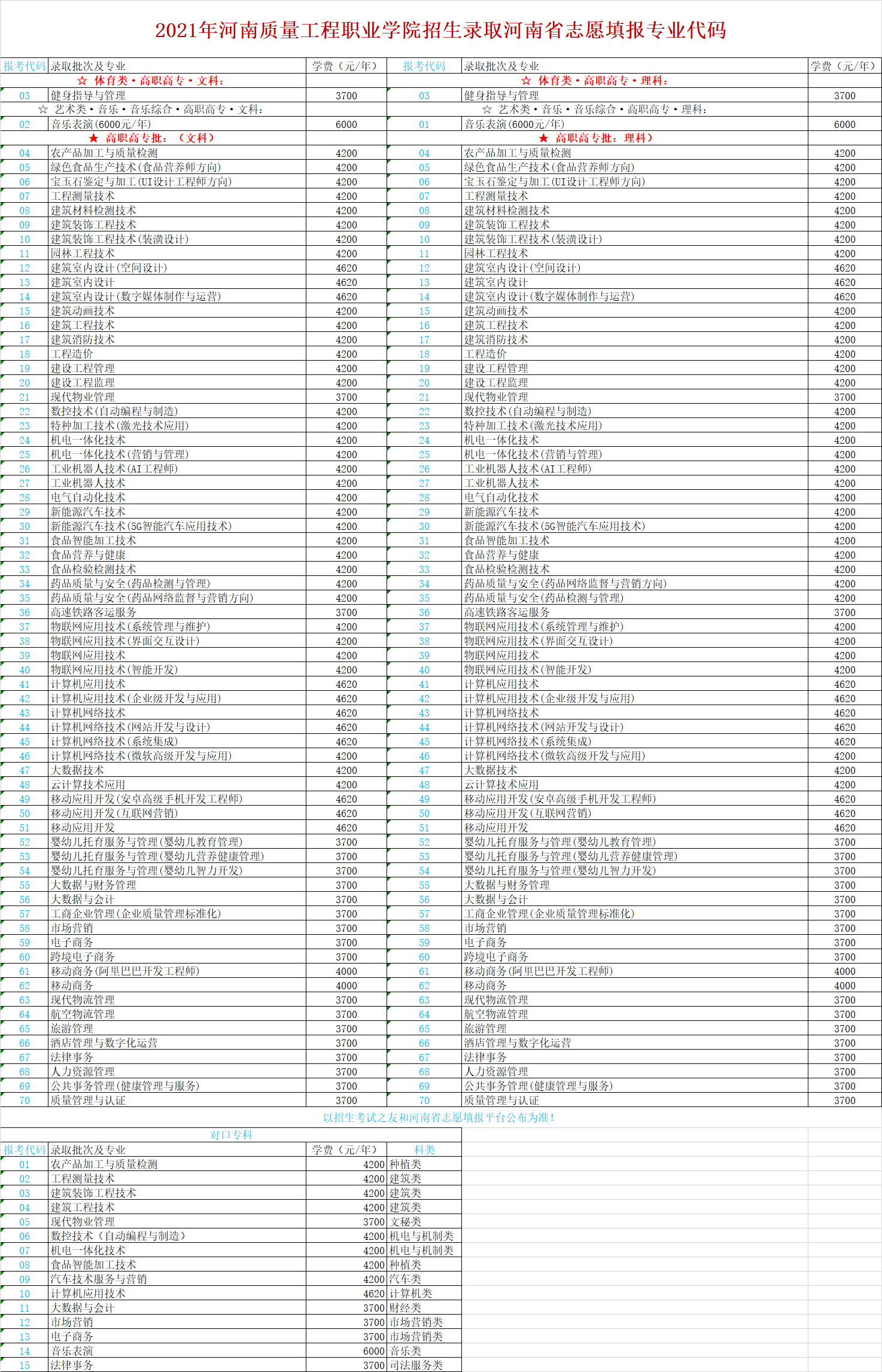 2021年河南省志愿填报专业代码