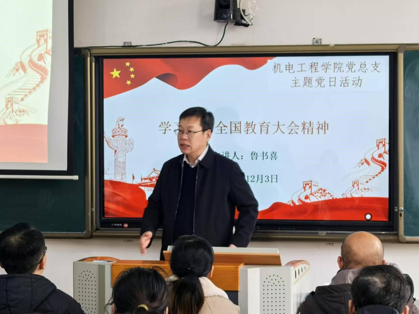12月3日下午,院长鲁书喜为联系教学单位——机电工程学院全体党员干部上了一堂题为“学习贯彻全国教育大会精神”的党课。