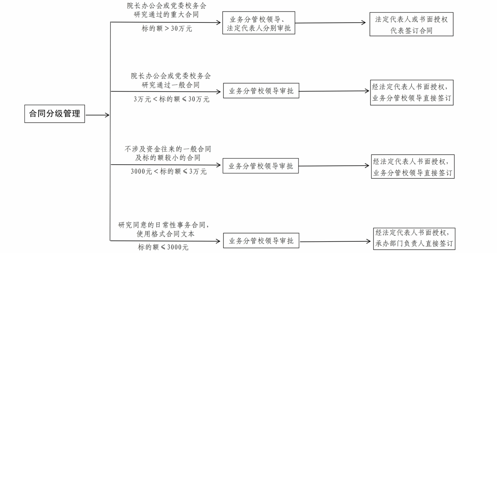 第十二条 按照合同性质、重要程度和标的金额大小,学校对合同实施分级管理,分为重大合同和一般合同。