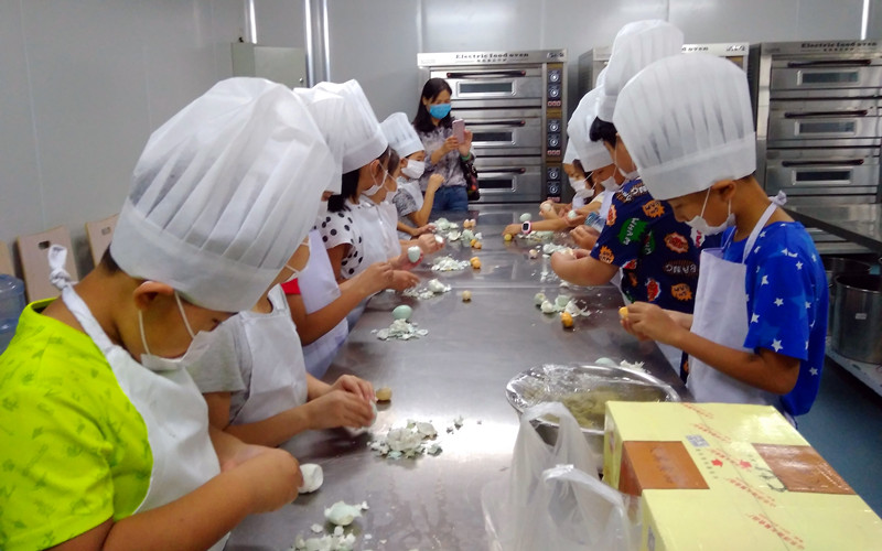 为了保证食品生产的安全,孩子们先洗净双手,换上整洁的工作服,穿戴上帽子、鞋套、口罩等,通过风淋通道消毒才进入到生产间。同学们首先参观了实训工厂车间,老师讲解了车间功能和安全知识后将已经调理好的饼皮面团分发给大家,在操作台上同学们将面团进行整形,然后包上不同的馅料,用月饼模具成型,放置于铺有油纸的烤盘中。然后将烤盘拿到焙烤间,把各种月饼放入设定好温度的烤箱中,在焙烤过程中,除了每间隔5分钟时间,需要观察一次月饼的焙烤程度,并根据情况进行适当调整,还利用闲暇自己制作了戚风蛋糕。20分钟后,月饼出炉了,很多孩子品尝到了自己第一次亲手制作的月饼,显得既兴奋又快乐。