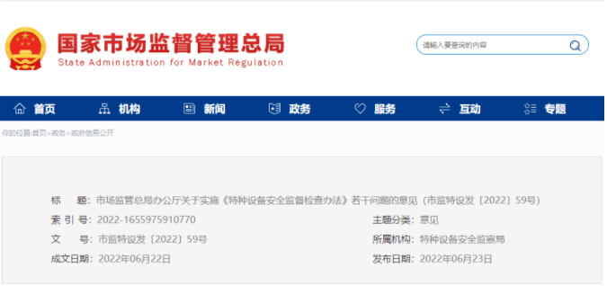 市场监管总局近日发出实施《特种设备安全监督检查办法》若干问题的意见,明确自7月1日起实施《特种设备安全监督检查办法》,并对常规监督抽查以及检验检测过程中发现问题的上报等方面内容作出提出意见。